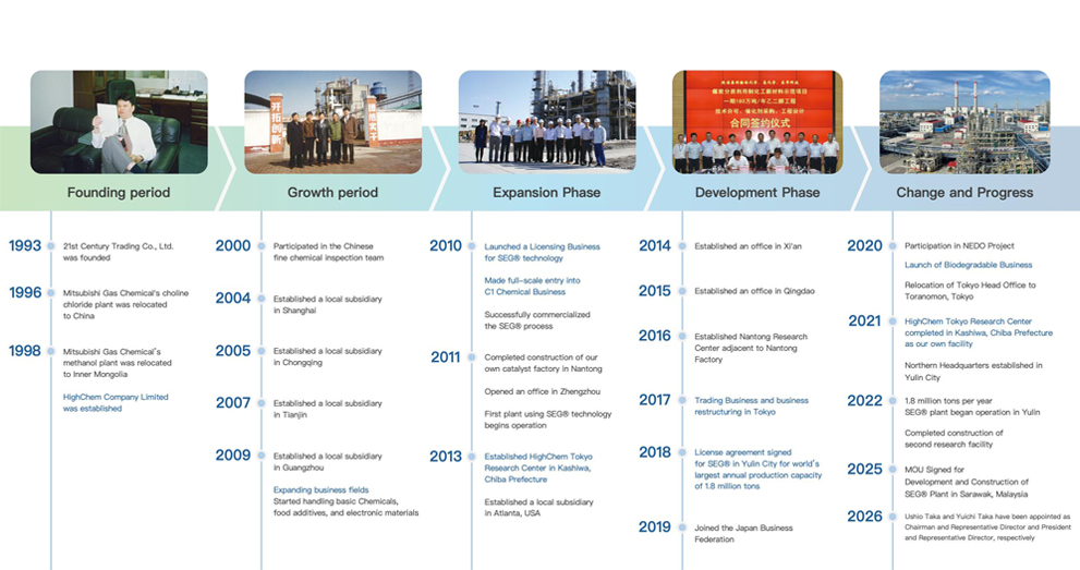 HighChem Company Limited was founded in Tokyo in 1998. The predecessor of the company 21th Century Company Limited was established in 1993. Since its inception, the company got rapid development and has set up branch companies and offices in Shanghai, Chongqing, Tianjin, Beijing, Guangzhou, Jiangsu and Atlanta, America. The company also successfully promoted the 20,000 ton hydrazine hydrate and ADCA foaming agent project.
